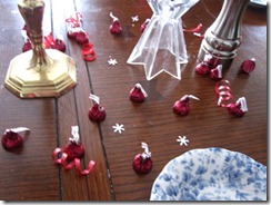 We put Hershey’s kisses around the table (the yummy yummy cherry cordial kind) and we put ribbon curls and snowflakes (because this was the day that it snowed 12 inches!!!)